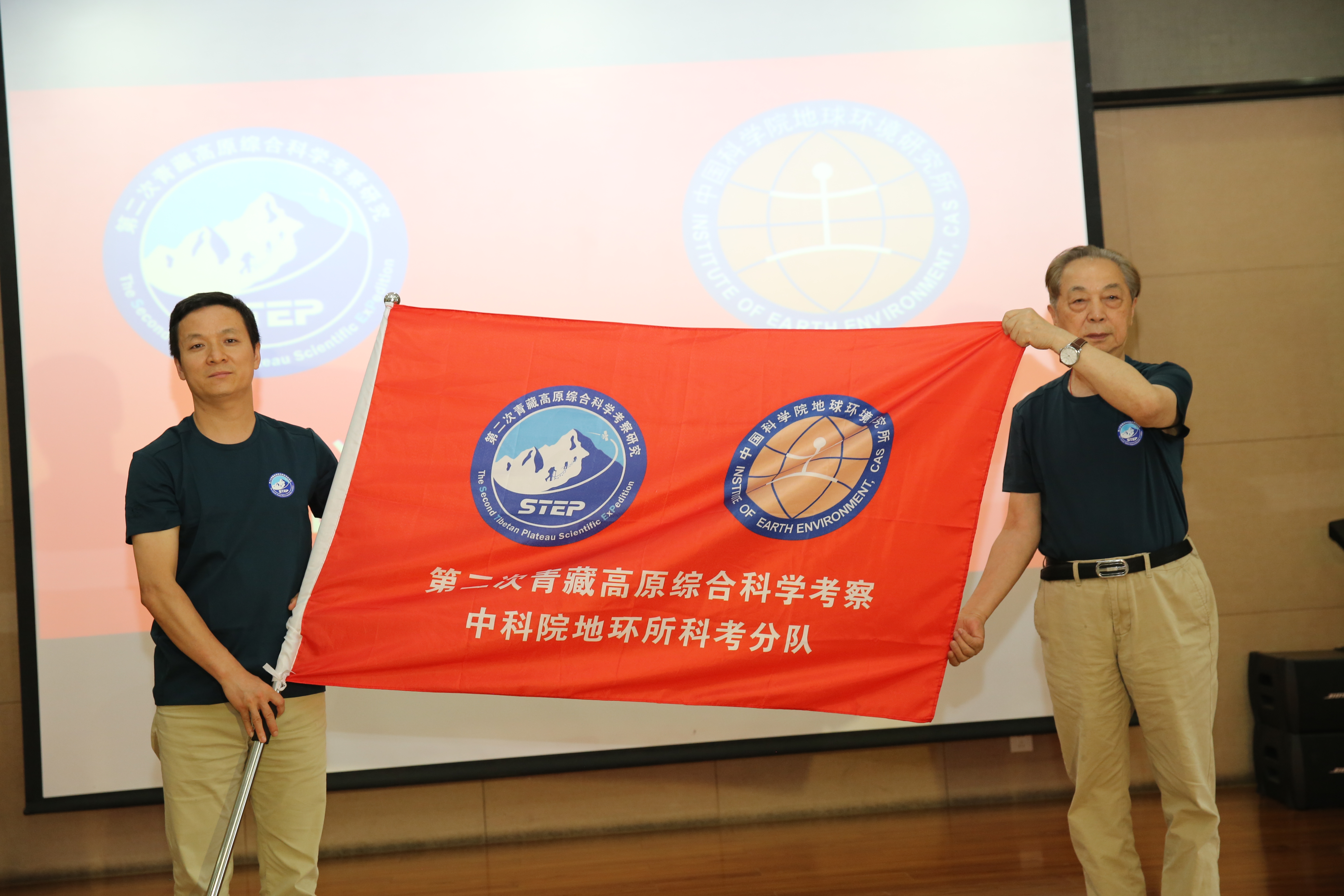 安芷生院士也來到出征儀式上,他說雖然這么多年我們所扎根在西部做了很多工作,但是仍然有不足的地方。這次科考,他請隊員們注意一個他本人一直很關心的科學問題:西部的水汽來源,是北冰洋,西風,還是季風。最后安院士也囑托科考隊高高興興出門,平平安安歸來,并授旗科考分隊隊長孫有斌副所長。