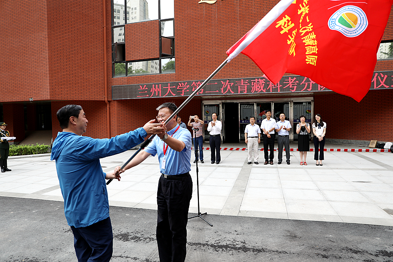 嚴純華為科考隊授旗。他指出,本次科考不僅是國家戰略,也是蘭州大學雙一流建設的重要舉措,我們要抓住第二次青藏高原科考的歷史機遇,進一步鍛煉學校大氣科學、地理科學、地質學和生態學等相關學科的教學科研隊伍,打造創新科研平臺。同時他強調,科考地點是人煙稀少的地區,科考隊員要注意安全,注意保護生態環境,希望科考分隊出征順達,工作順利。
