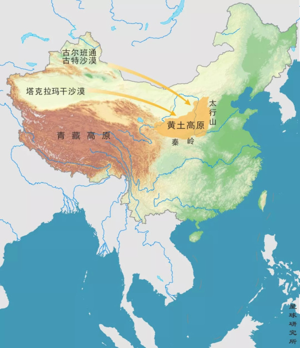 冬季,強勁的西風也受到青藏高原的阻擋不得不改變路徑,它們吹起西北沙漠戈壁中的沙塵沿著青藏高原北部邊緣向東推進,沙塵顆粒在太行山以西、秦嶺以北降落,形成了黃土堆積厚度高達400米的黃土高原。