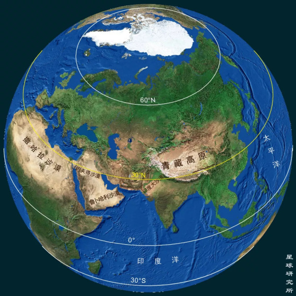 受此影響,北緯30°附近出現(xiàn)了大面積的干旱地帶,從北非到西亞幾乎連成一片。如果沒有意外,同樣位于北緯30°附近的中國南方地區(qū)也會比現(xiàn)在干燥得多。