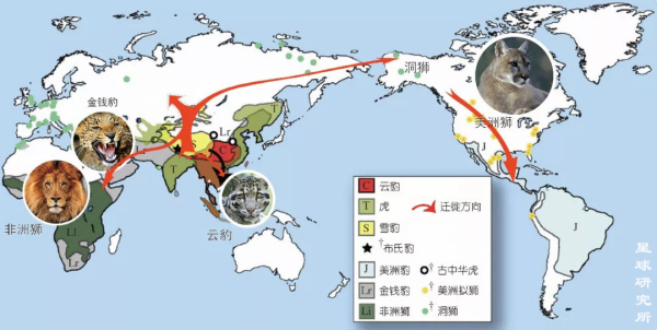 隨后更深入的研究,揭開了一個驚人的秘密:豹亞科動物居然都起源于青藏高原,它們曾走下高原進入東、南亞,演化出了古中華虎、云豹,又進入美洲演化出了美洲獅,還進入非洲,演化出了非洲獅、金錢豹。